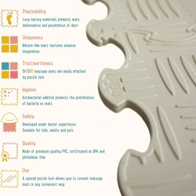 Setul de covorase puzzle pentru stimulare senzoriala include 16 piese modulare, cu textura rigida.